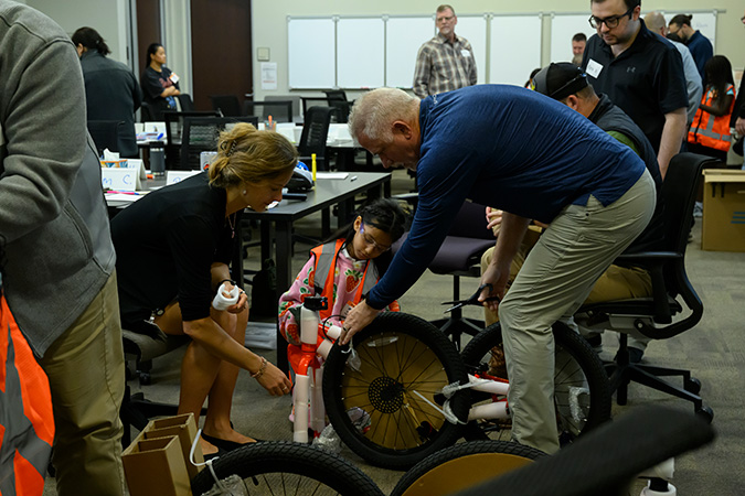 In the photos: During 2025 PLT sessions, BNSF employees enjoyed the chance to work with local students to complete team STEM exercises and build and donate 1,110 bicycles.